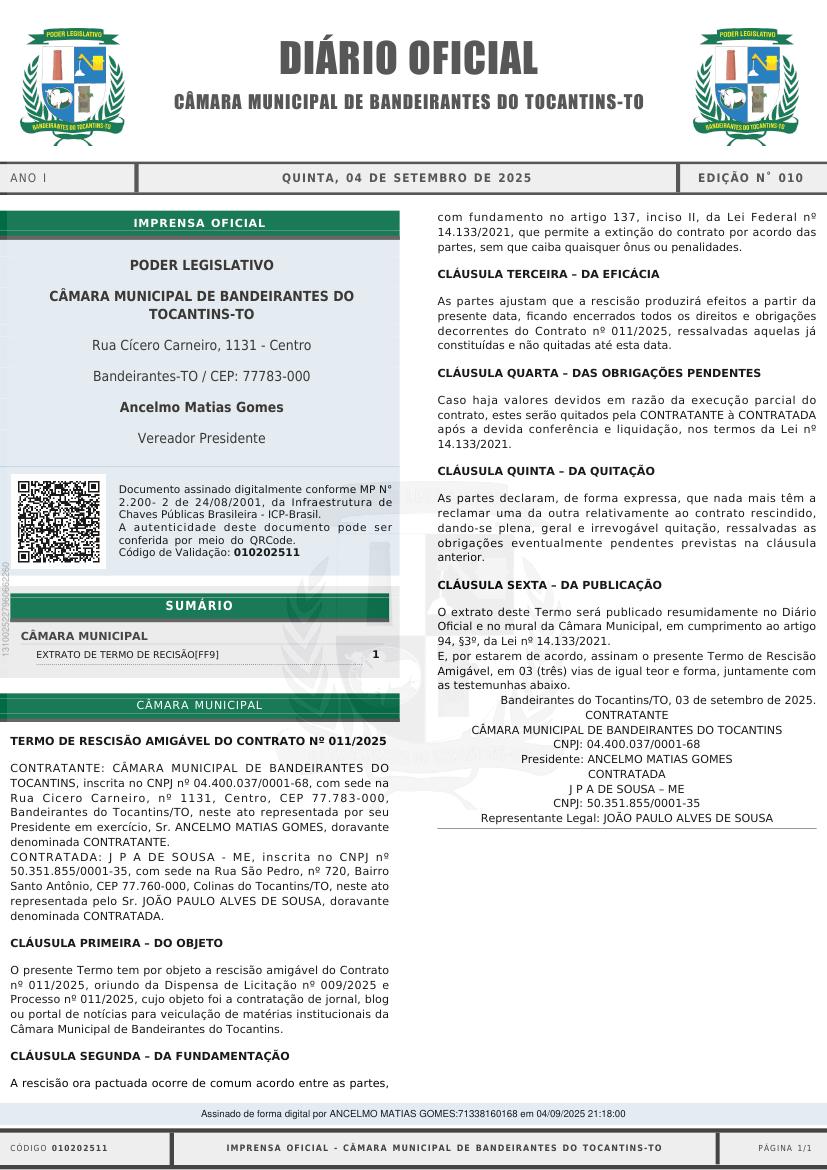 27/06/2025 Câmara Municipal Presidente da Câmara de Bandeirantes, Ancelmo Matias, participa de evento sobre Primeira Infância e cumpre agenda estratégica em Palmas, incluindo visita ao TCE e tratativas sobre energia solar para a Casa de Leis 27 de June de 2025 Ler notícia completa